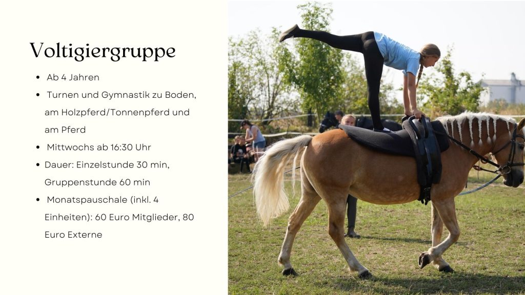 - Sitzschulung, Western, Dressur, Stangen- & Cavaletti-Training, Geschicklichkeitsparcours, Reiterspiele, Mounted Games, Ohne-Sattel-Reiten, Musik-Reiten, Kür-Training, Aufgaben-Training