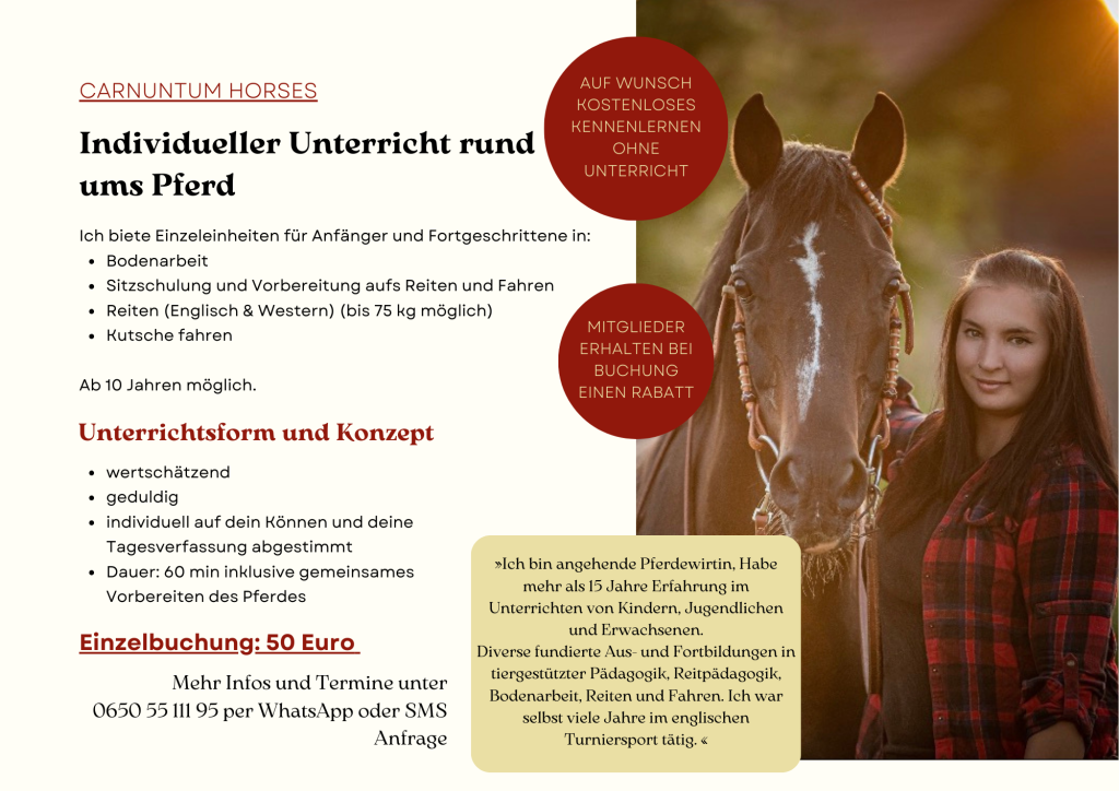 Der respektvolle, sichere und pferdegerechte Umgang steht bei uns an erster Stelle. Deshalb ist der Einstieg bei Carnuntum Horses immer über eine Pflegebeteiligung vorgesehen. Erst wenn das selbstständige Agieren mit dem Pferd im geschützten Rahmen erlernt wurde, ist der nächste Schritt – eine Reit- oder Fahrbeteiligung – möglich.